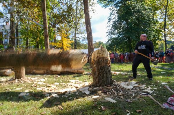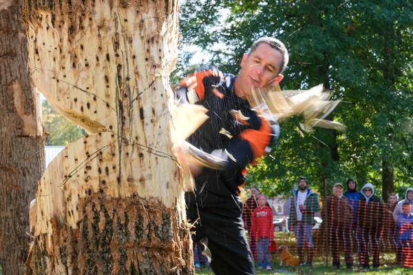 Successful, Arden Cogar Jr. watches as a stubborn log finally comes down after sustained chopping during the Forestry Festival in Elkins in October 2023.