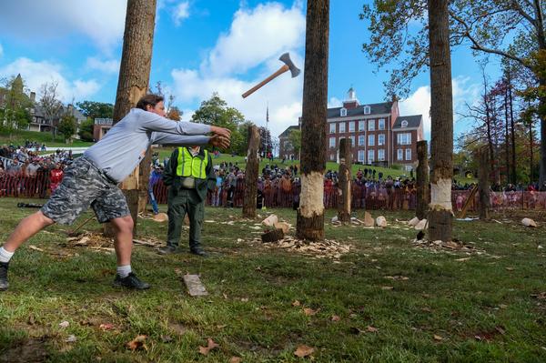 A man competing in the ax throw at the Mountain State Forest Festival in Elkin hurls an ax at a target in October, 2023.