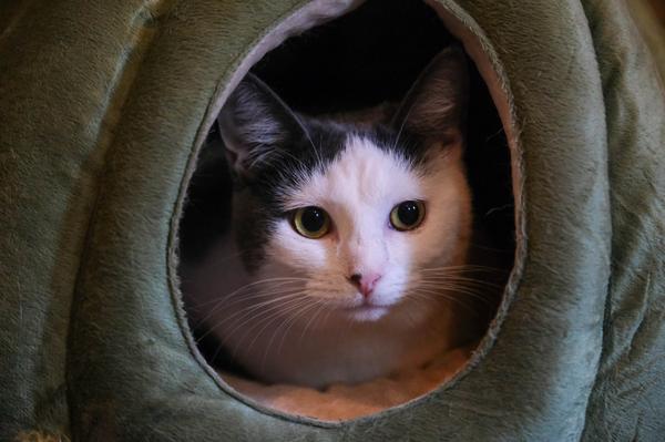 A black cat from Mugs n Mittens Cat Cafe in Fairmont aquiesce to forbidden belly rubs on Sept. 30, 2023.