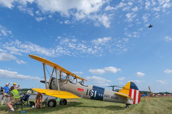 One of the world's most advanced fighter aircraft, an F-22 Raptor, flies past the windshield of a PT-17 Stearman, a WWII trainer aircraft used to train pilots in the '30s and '40s at the Martinsburg Airport on Aug. 26, 2023.