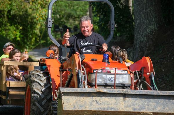 Delbert Harker, patriarch of the family that owns Poplar Island Pumpkins, tows a hay rides back to the ride's starting point on his tractor on Sept. 16, 2023.