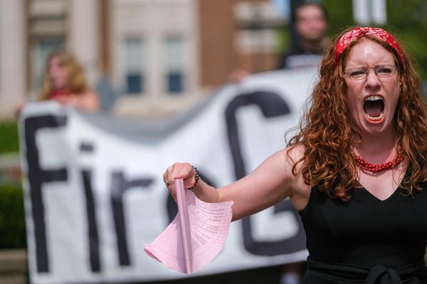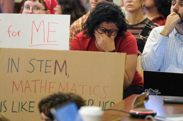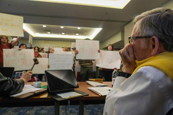 WVU President Gordon Gee listens to a presentation Associate Provost Mark Gavin gives to the Board of Governors on WVU's academic transformation while Jon Loy holds a sign criticizing Gee in the background on Sept. 15, 2023.