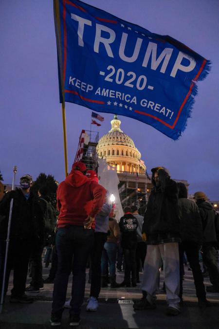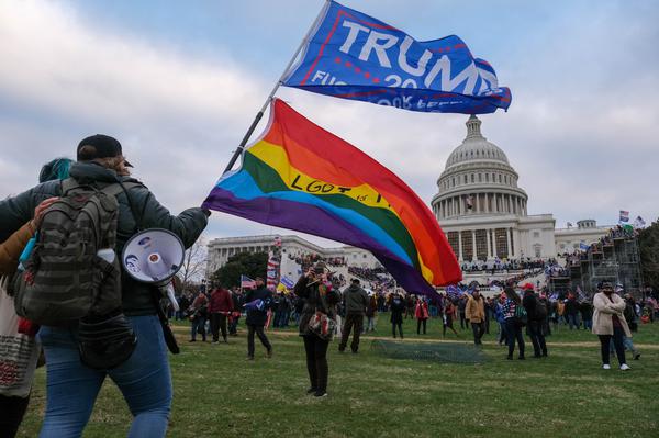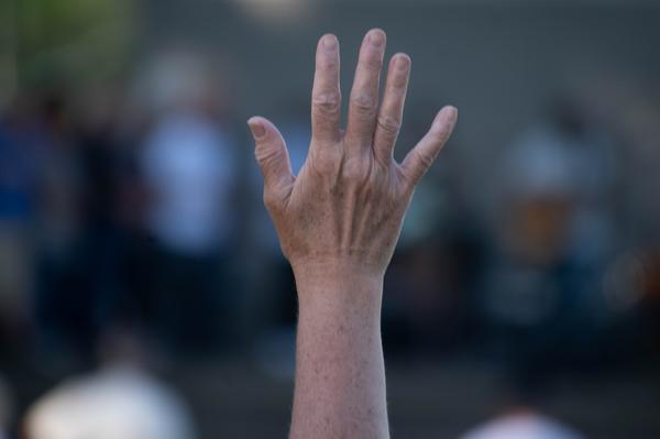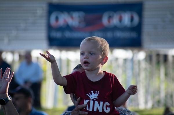 A child brought by his parents to the National Day of Prayer event in Palatine Park on May 2, 2024 sits on top of the shoulders of a male relative.