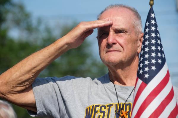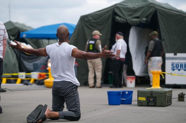 A man role playing as a crisis actor raises his arms in frustration as emergency workers carry other crisis actors who have more severe simulated injuries during a disaster drill at Bridgeport Airport in July 14, 2023. Chemical burns were the focus of the simulated exercise.