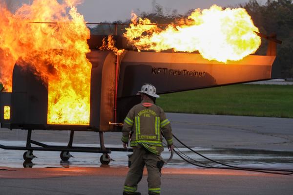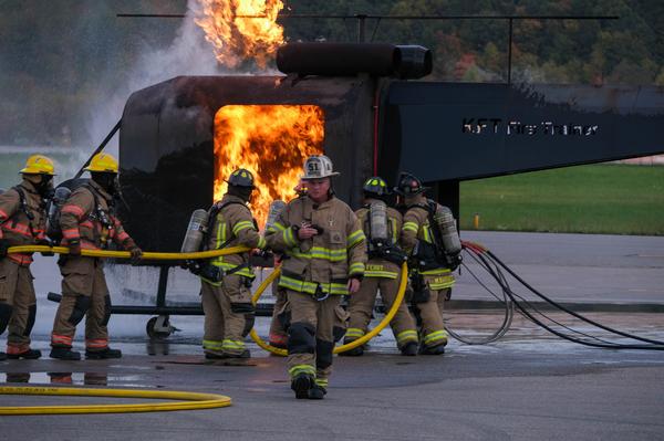 A firefighter appraises maintains communications with other rescue workers while a team of firefighters works to put out a simulated helicopter blaze at the full scale emergency exercises conducted at the Bridgeport Airport Oct. 4, 2023.