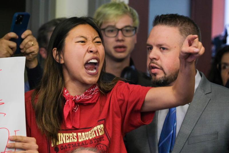Mai-Lyn Sadler unleashes her fury on the board of governors during the vote to cut several of the school's programs at a Board of Governors meeting at WVU Sept. 15, 2023.
