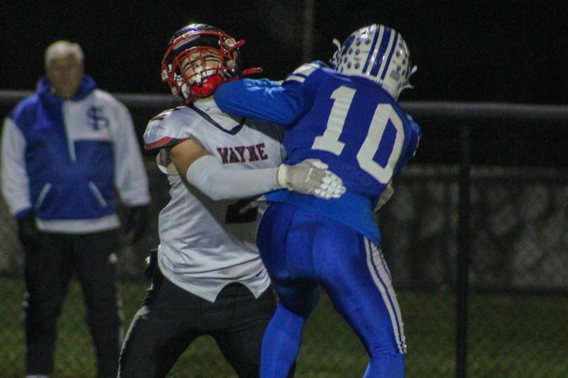 Cannon Dinger, 10, holds a Wayne player back during the playoff game between Fairmont Senior and Wayne High. The second half featured much more intense gameplay, due to the urgency from both teams to not be taken out of contention.