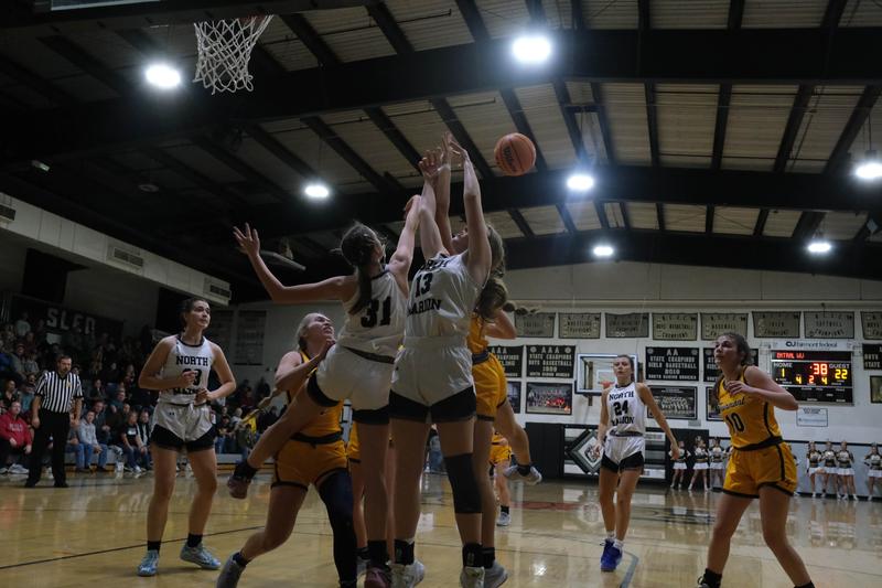 Players from North Marion High and East Fairmont High try to catch the ball on rebound during the game between both schools on Dec. 14, 2023.