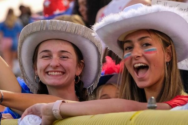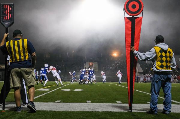 Two members of field crew watch as fog starts to roll in over East-West Stadium during the Mohigan vs Polar Bears game.